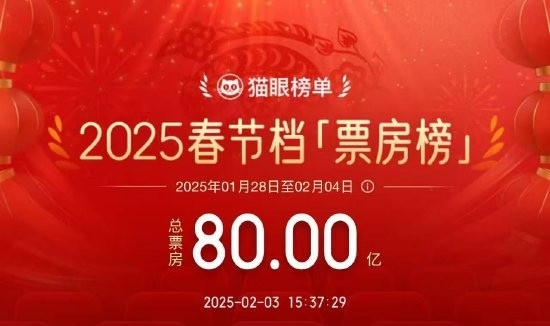 大皖新闻讯据猫眼电影专业版数据,截至2月3日下午15时37分,2025年春节档(1月28日至2月4日)电影市场总票房突破80亿元(含预售),稍晚时候约15时50分,档期票房达到80.17亿元(含预售),反超此前票房最高的2024年中国影史春节档(80.16亿)。